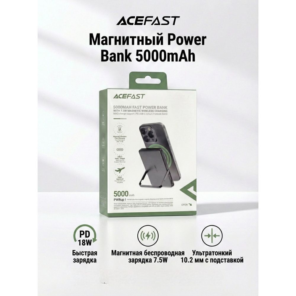 Внешний аккумулятор (Power Bank) Acefast M16 5000 mAh (18W, беспроводная зарядка MagSafe, Type-C) Черный — это компактный и мощный источник энергии для ваших устройств, который идеально подойдет для мобильных пользователей. С емкостью 5000 mAh, он способен зарядить смартфоны, наушники и другие гаджеты, предоставляя дополнительное время работы в любых условиях.